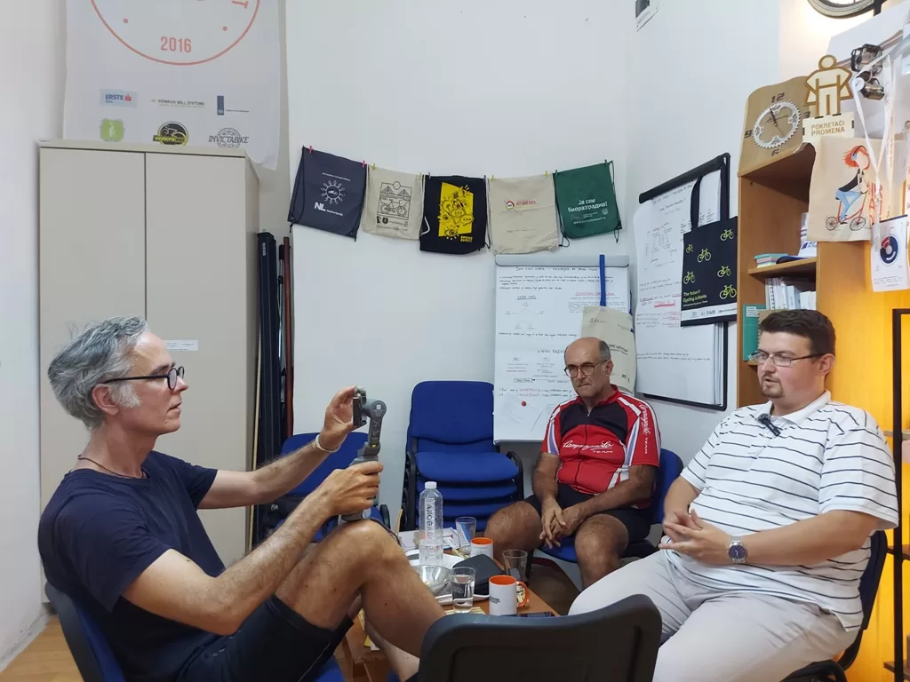 Konačno, na biciklima smo i lagano putujemo putem koji je za mene repriza jučerašnjeg dana, ali u suprotnom smeru. Nakon manje od sat vremena zastajemo u restoranu uz obalu Dunava. Pijemo kafu gotovo sat i po, a Gijom razgovara telefonom… dugo, vrlo dugo. Konačno, putujemo ka Novom Sadu. Vozimo nešto više od sat vremena, prešli smo 25km i stajemo ponovo u restoran… Koliko smo vozili, toliko smo i sedeli uz pivo… Lagano, lagano, stigosmo u Novi Sad. Uz kratak obilazak centra grada stižemo u prostorije „Novosadske biciklističke inicijative“ gde nas dočekuje Marko Mazalica. Upoznajemo se sa radom organizacije, Gijom pravi intervju sa Markom i potrošismo još dva sata. Još malo šetnje kroz grad i na putu smo u Sremske Karlovce gde ćemo prenoćiti.