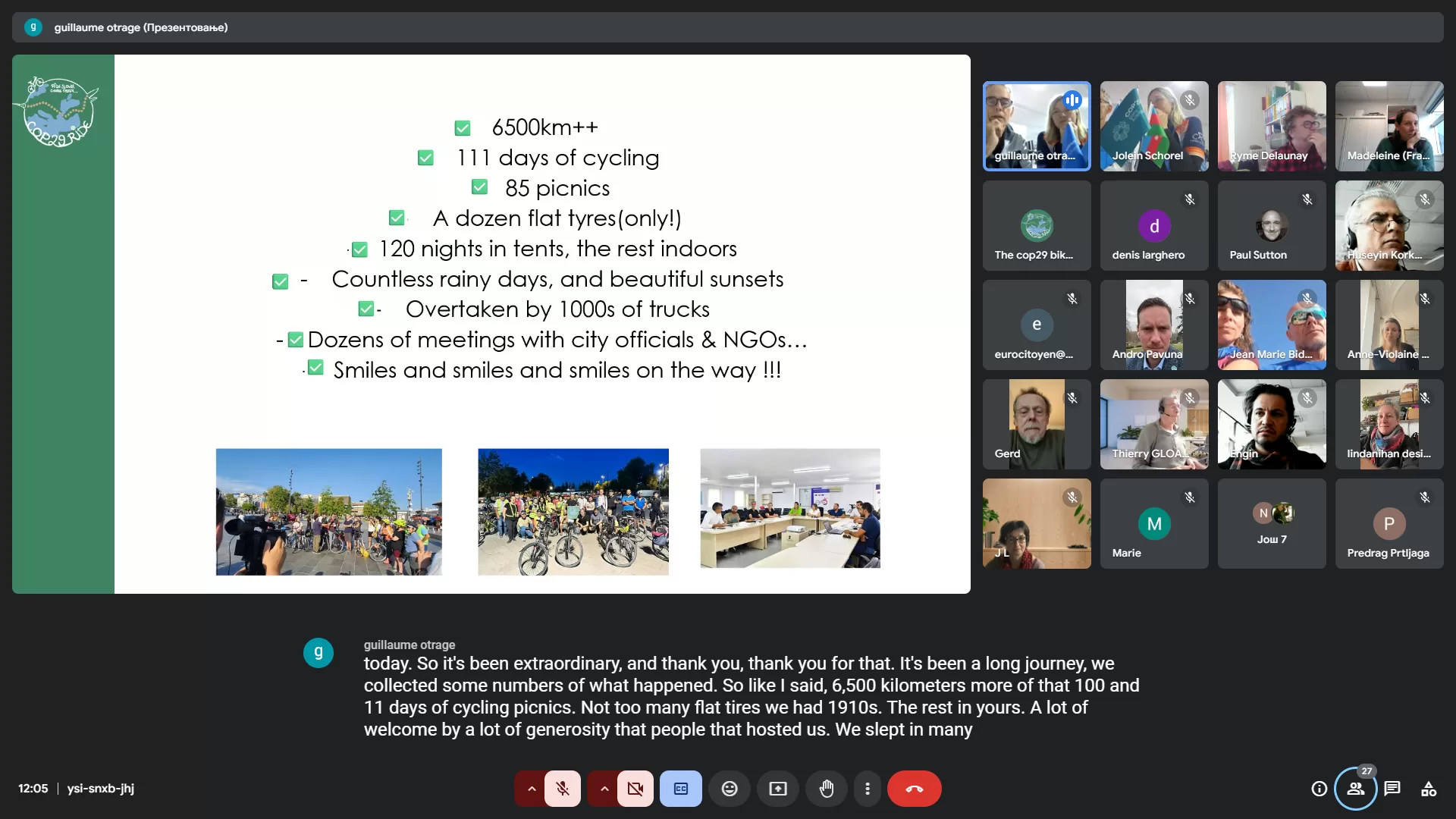 Sa Milanom sam se ponovo video i družio u Temerinu. Ne znam kako je (tj. s kim je) Gijom dalje putovao kroz Srbiju. Vrlo malo informacija je dostupno o tom delu puta. Ali, stigao je početkom novembra u Baku na konferenciju COP29. Zahteve je predao, imao priliku da prezentuje svoje putovanje i cilj je ispunjen. Nakon konferencije, 19. novembra imali smo onlajn sastanak gde su prezentovani detalji putovanja, učešća na konferenciji i Gijomova dilema. Naredna konferencija je u Brazilu, preko okeana je nemoguće voziti bicikl 😊. Zamolio je da, ako neko ima dobru ideju kako biciklom stići iz Evrope u Brazil, javi!