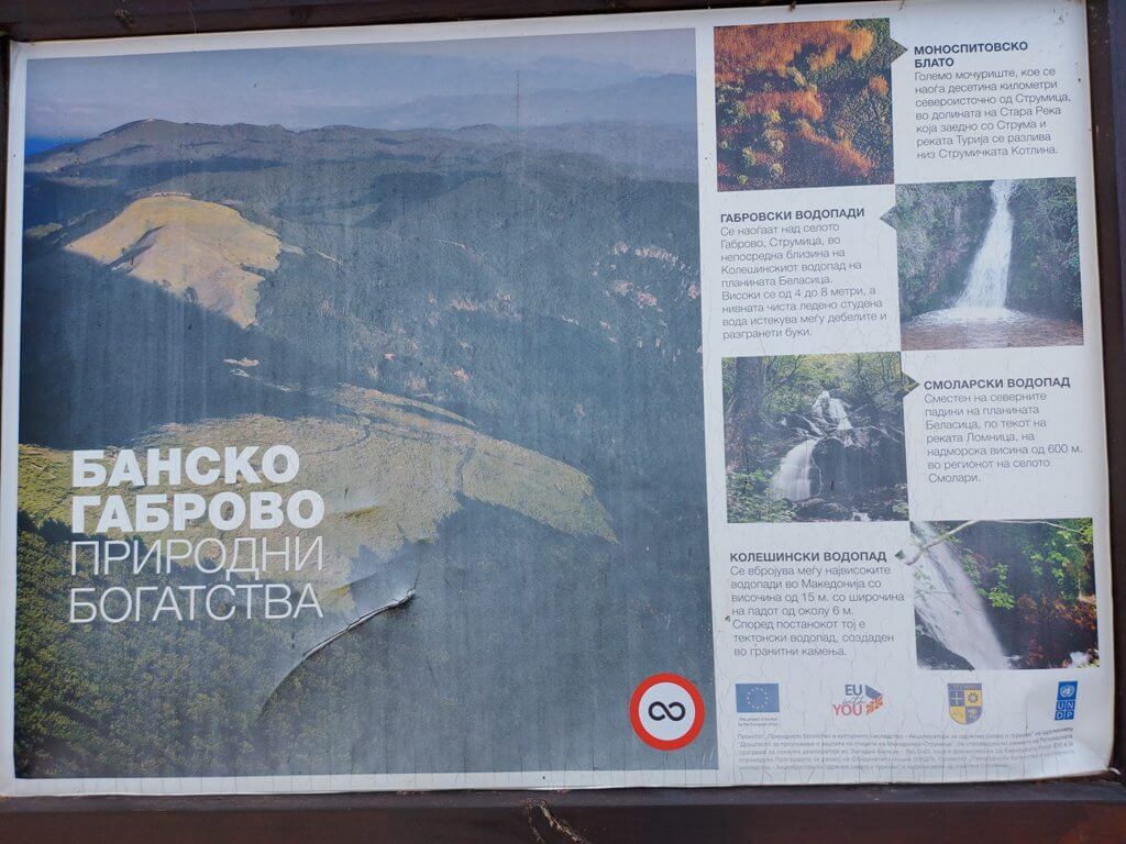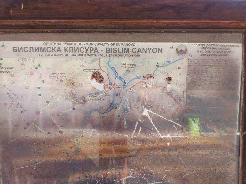 Nepunih 5km i bio sam na velikom parkingu sa tablom koja nije u najboljem stanju, ali nazire se neka mapa i tekst. Dobredojdovte vo prekrasnata nedoprena priroda (Welcome to this Amazing Untouched Nature) piše na tabli i jedva čekam da siđem sa nadvožnjaka iznad klisure u prirodu. Ali ne…