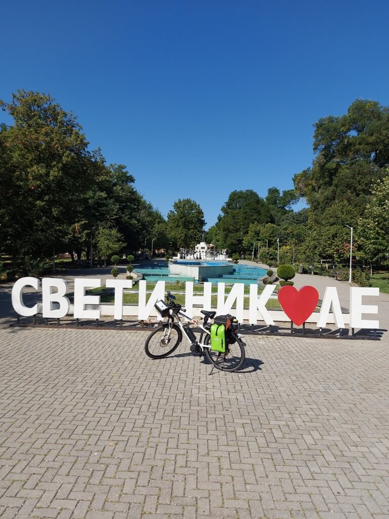 Dobredojdovte u Sveti Nikole, lepo uređen park u centru grada. Zanimljivo mi je ime grada. Odmaram, razmenim par reči sa penzionerima koji igraju šah u debeloj hladovini. Na izlazu iz mesta neki tematski otpadi, samo VW bube, potom avioni???