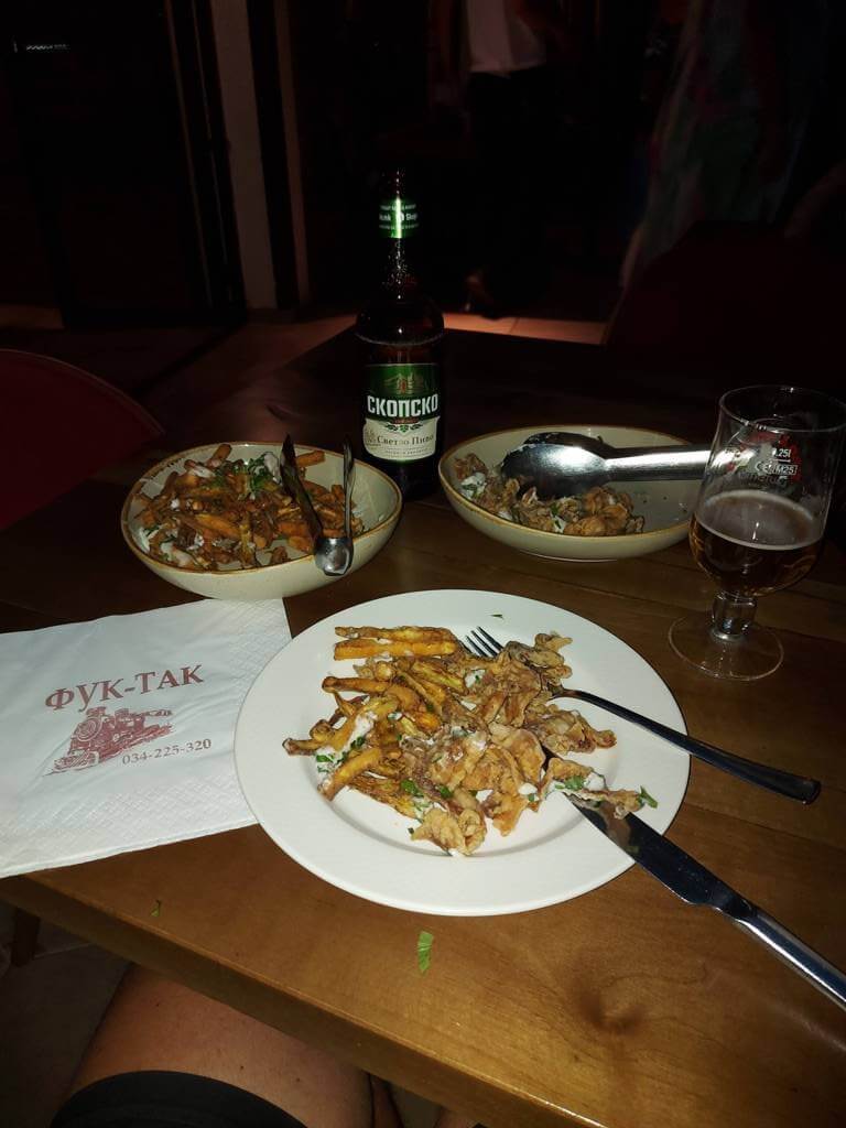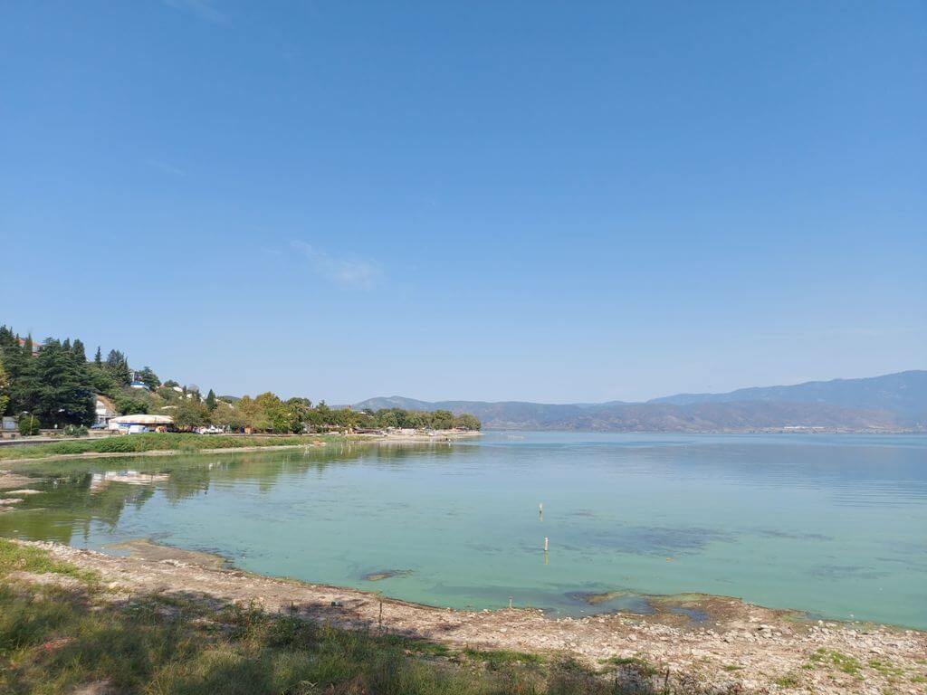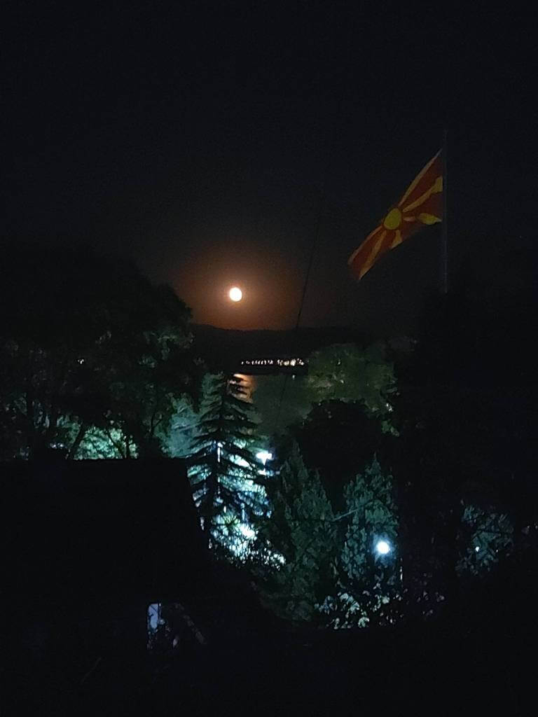 Kasnije večera. Konačno radni dan, dobro poznata kafana, nalazim tj. nalaze mi sto (što nije tako lako). Mada sam na jezeru, odabrana hrana me podseća da sam sve bliže moru. Noć, pogled na jezero, mesec, pozdrav makedonskoj zastavi.